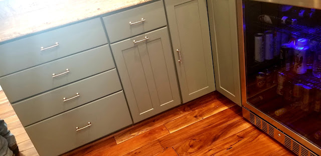 It's an exciting prospect to see so many clients now thinking outside of the box of only shades of white for their cabinet refinishing transformations. Steep Cliff Gray (2122-20) with its strong blue undertones illuminates this kitchen with gorgeous new life. And the contrast of Iron Gate (1545) inside the cabinets with glass doors is a perfect pairing with the backsplash wall surrounding them!